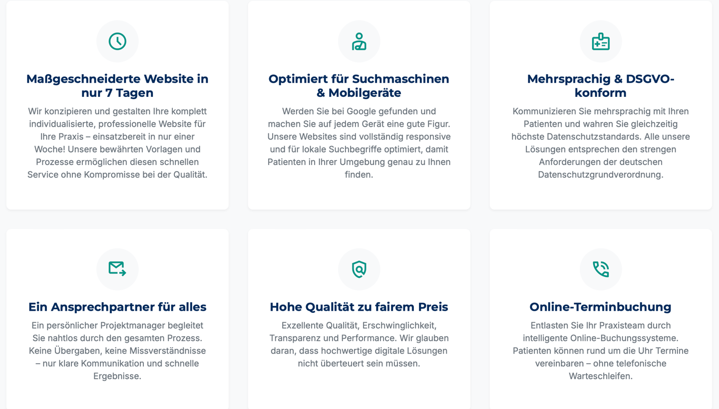 Wir konzipieren und gestalten Ihre komplett individualisierte, professionelle Website für Ihre Praxis – einsatzbereit in nur einer Woche! Unsere bewährten Vorlagen und Prozesse ermöglichen diesen schnellen Service ohne Kompromisse bei der Qualität.