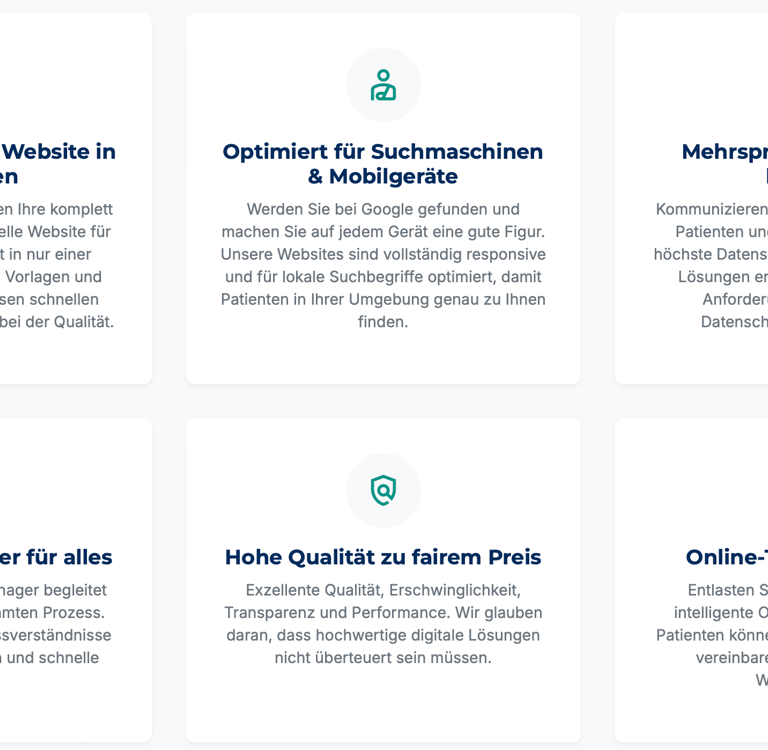 Werden Sie bei Google gefunden und machen Sie auf jedem Gerät eine gute Figur. Unsere Websites sind vollständig responsive und für lokale Suchbegriffe optimiert, damit Patienten in Ihrer Umgebung genau zu Ihnen finden.